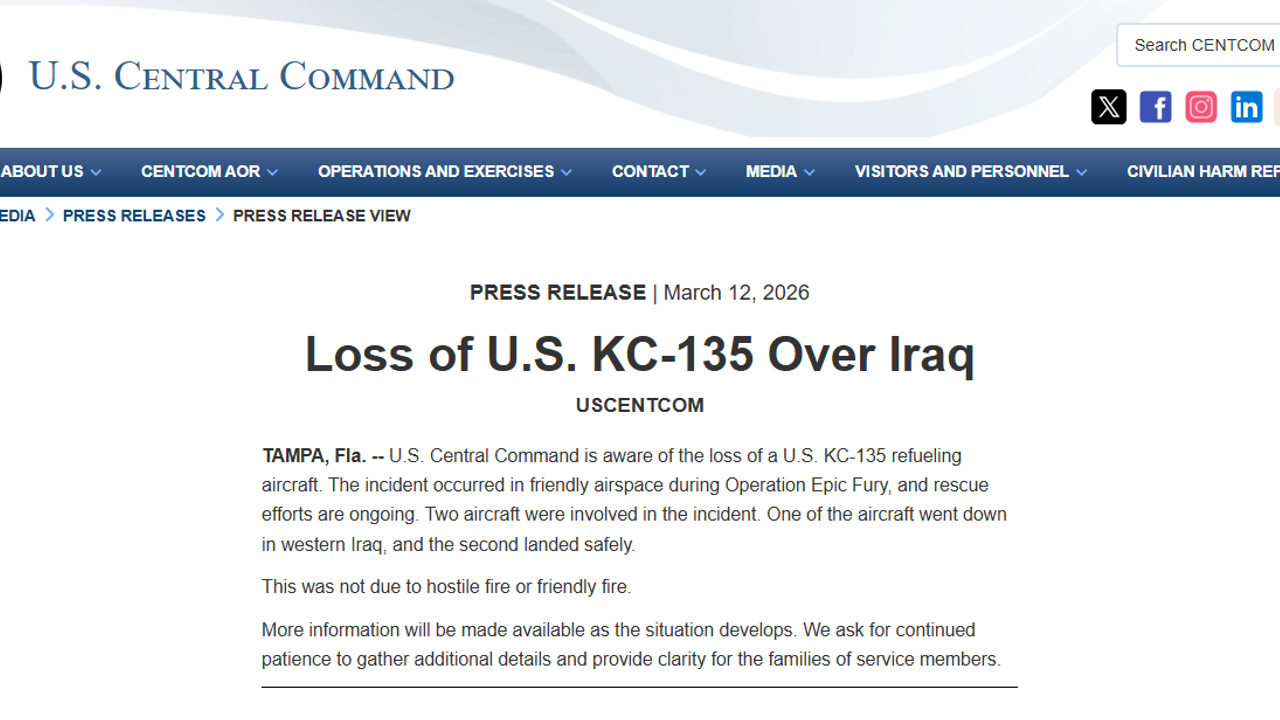 ABD Merkez Komutanlığı (CENTCOM), KC-135 tipi bir yakıt ikmal uçağının Irak'ta düştüğünü duyurdu. Kazanın Epic Fury Operasyonu (Destansı Öfke Operasyonu) sırasında dost hava sahasında meydana geldiği belirtilen açıklamada, kurtarma çalışmalarının devam ettiği ifade edildi. Kazaya 2 uçağın karıştığı belirtilerek, 'Uçaklardan biri Irak'ın batısında düşmüş, diğeri ise güvenli bir şekilde iniş yapmıştır. Bu, kaza düşman ateşi veya dost ateşi nedeniyle yaşanmamıştır. Daha fazla detay ortaya çıktıkça kamuoyuna detaylı bilgi verilecektir' denildi.