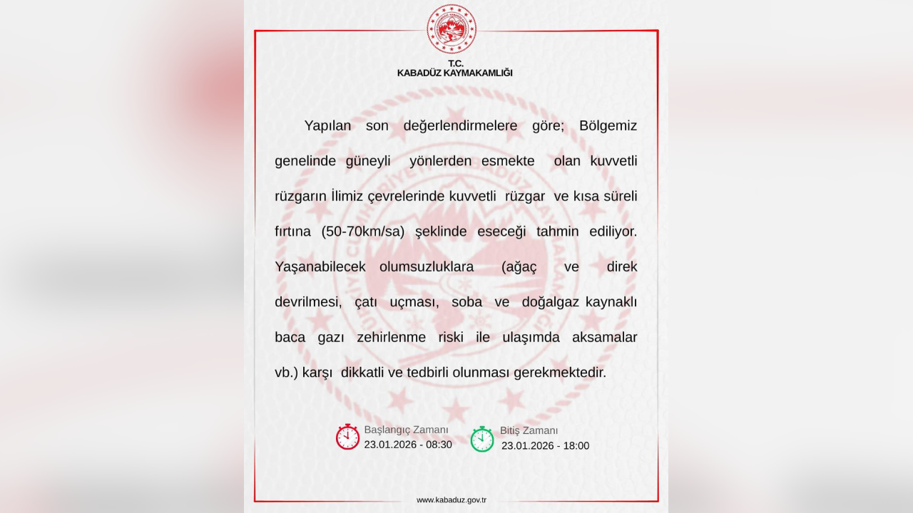 Ordu’nun Kabadüz ilçesinde bugün etkili olması beklenen kuvvetli rüzgar ve kısa süreli fırtına nedeniyle Kaymakamlık vatandaşları uyardı. Meteorolojik verilere göre rüzgar hızının saatte 50-70 kilometre arasında seyretmesi bekleniyor. Yetkililer, olası olumsuzluklara karşı tedbirli olunmasını istedi.